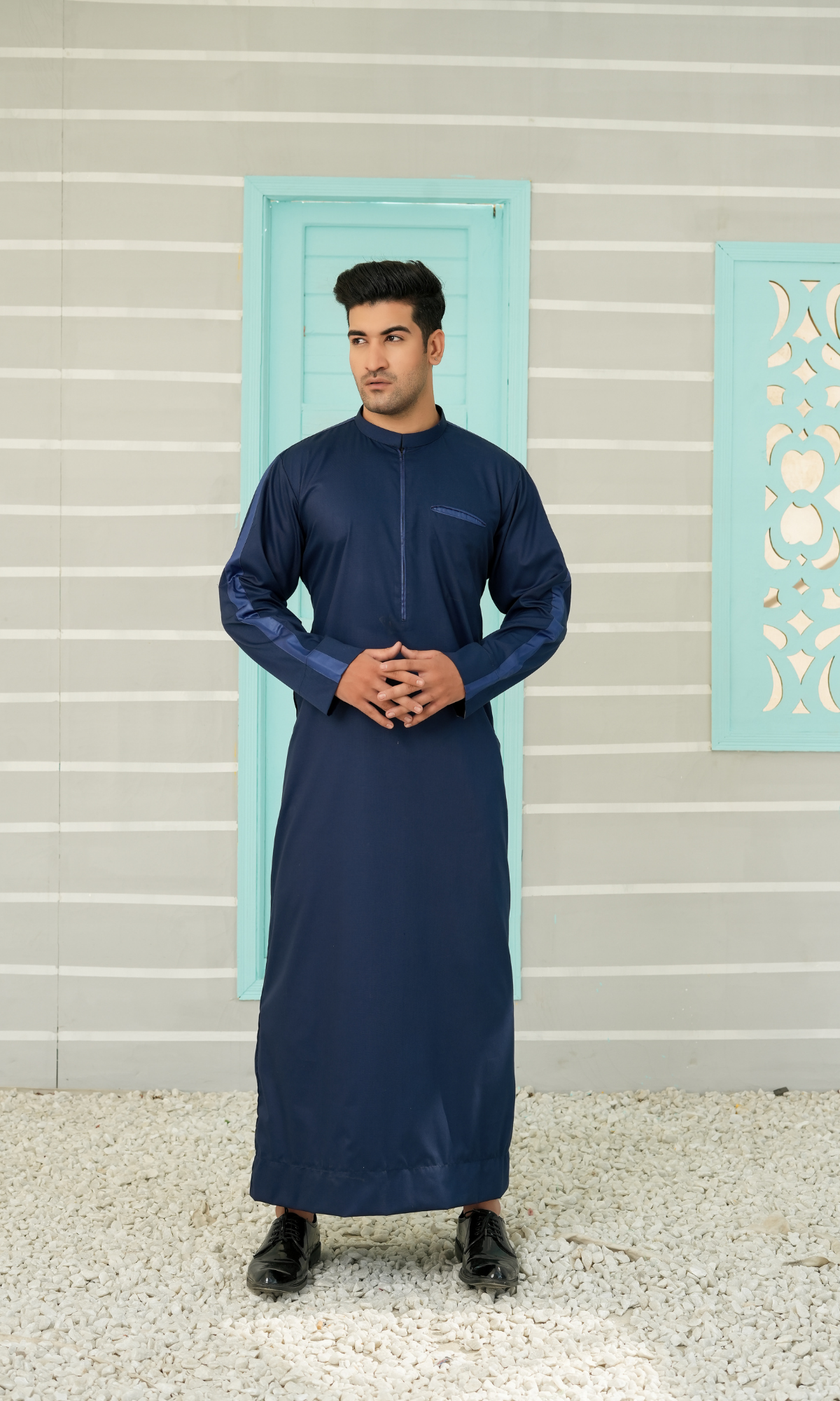 Stay comfortable and modest with our Navy Blue Islamic Jubba Dress. This dress is made with soft and breathable fabric, perfect for all-day wear. The navy blue color adds a touch of elegance to your wardrobe. Complete your look with this helpful dress.