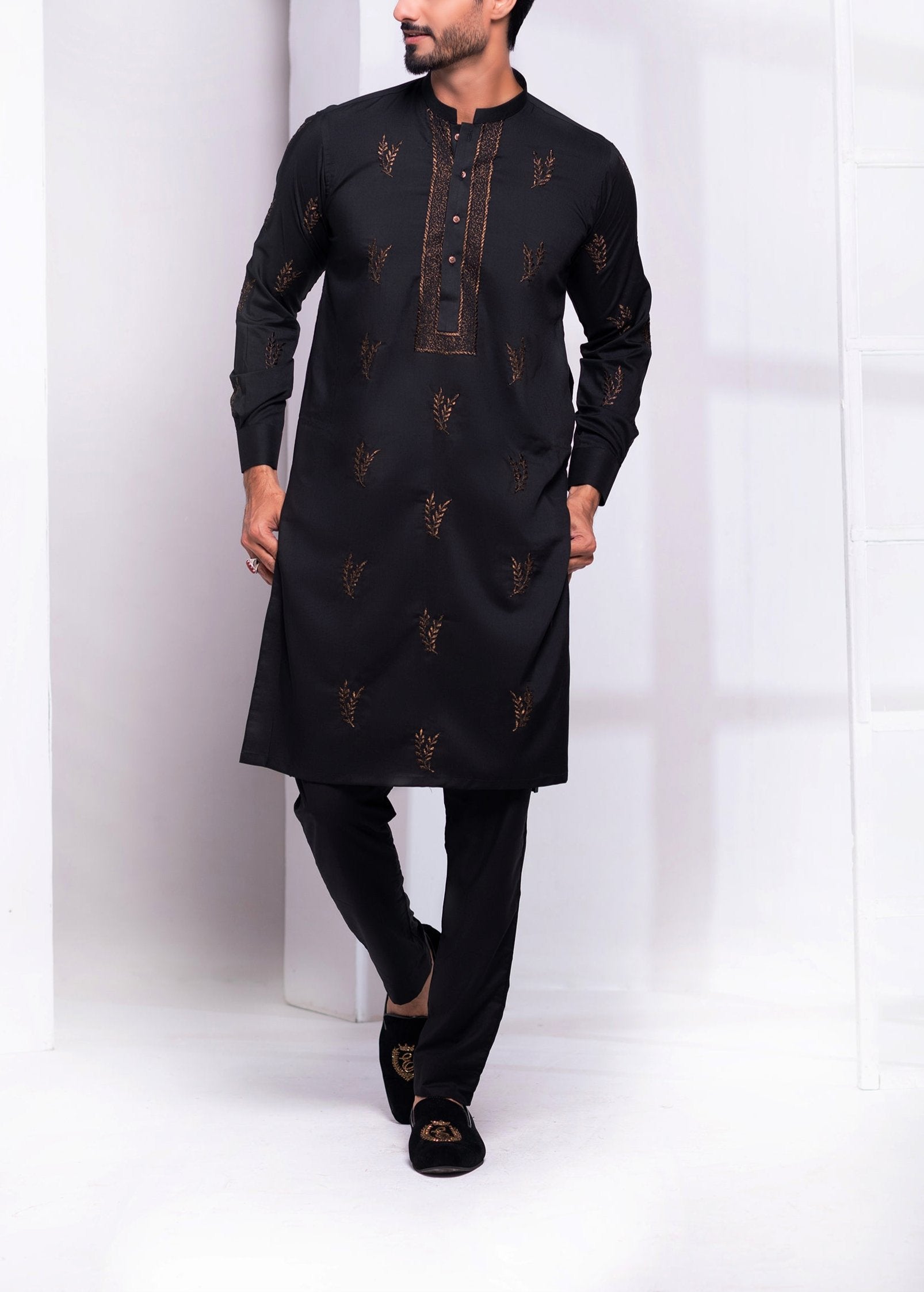 This kurta pajama is adorned with intricate RSH embroidery, adding a touch of style and elegance to your wardrobe. Made with high-quality fabric, this comfortable outfit is perfect for all occasions. Elevate your traditional wear game with this beautiful design.